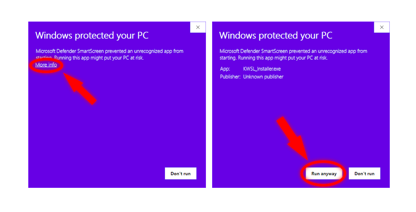 Open KWSL_Installer.exe, click "More info" and then "Run anyway"